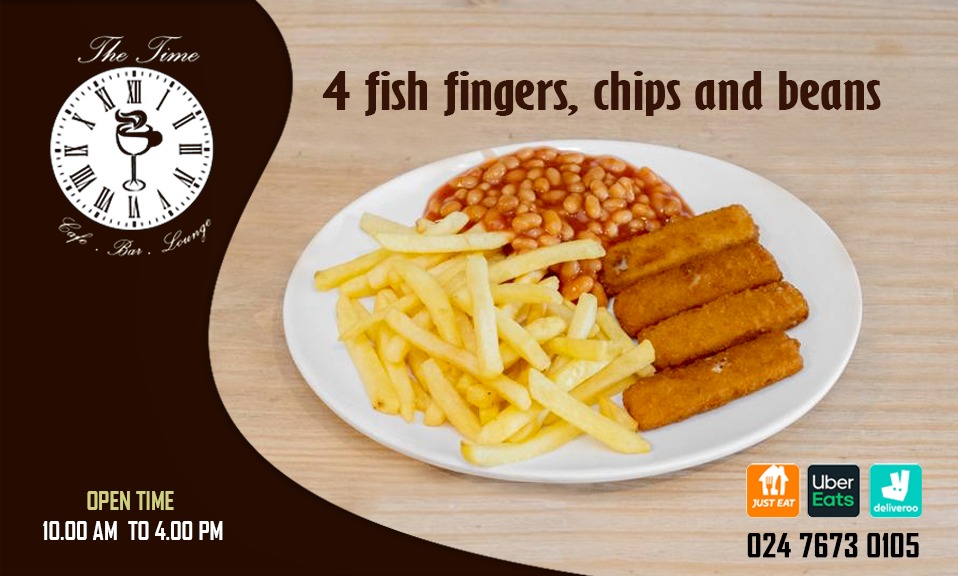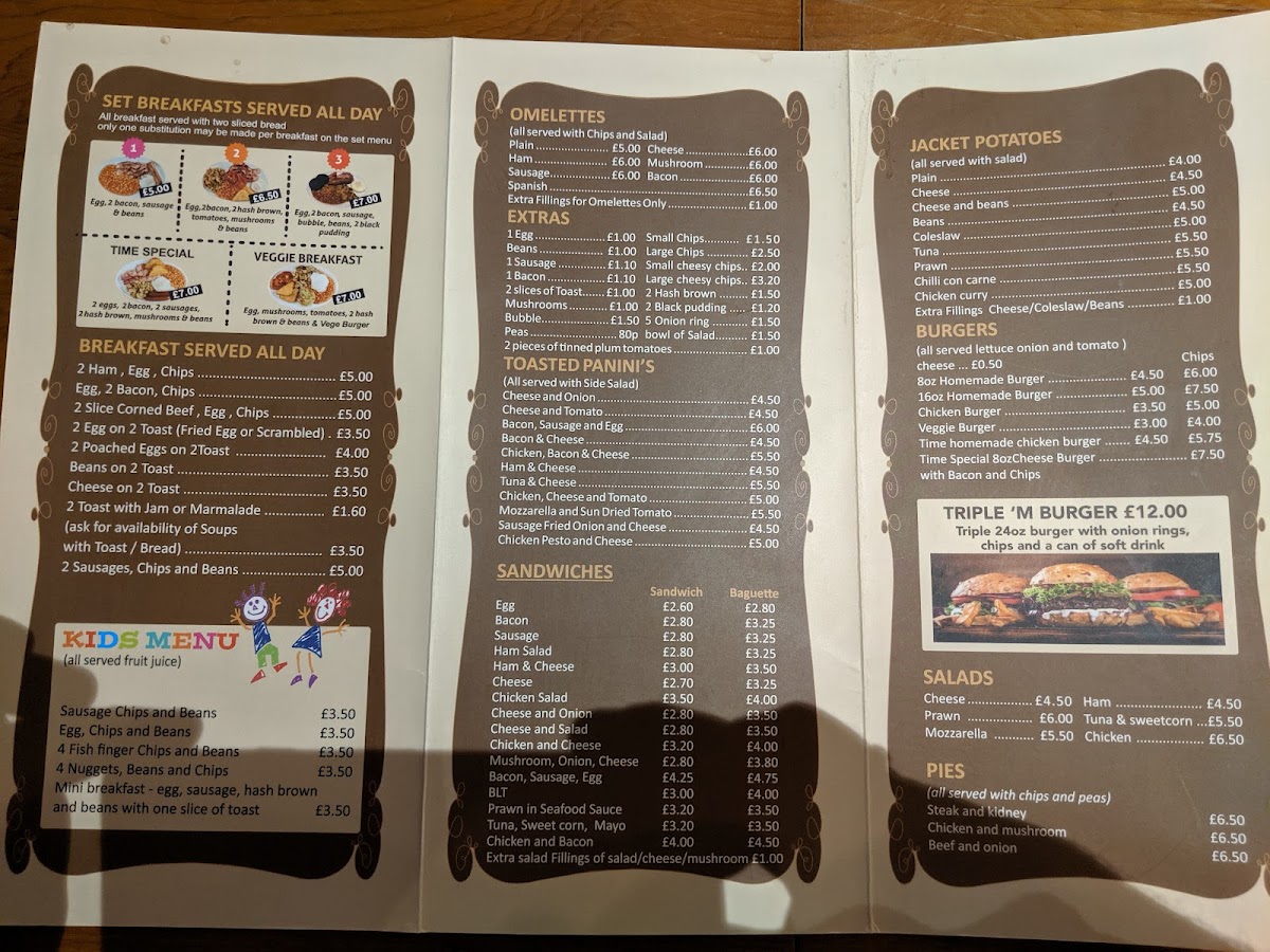 From a reviewer’s perspective, the menu at The Time Café & Bar offers a comforting selection of classic British and café-style dishes that cater to a wide range of tastes. The fish section features hearty options like Cod And Chips With Peas/Curry Sauce With Bread And Butter, Mini Fish And Chips, and Scampi, Chips And Peas, while the roast options such as Roast Beef, Roast Chicken, and Children's Roast Dinner provide traditional Sunday-style meals. For something more filling, the Time Lunch and Grills section includes favorites like Lasagne, Chips And Salad, Chilli Con Carne With Rice And Chips, Chicken Curry With Rice And Chips, Gammon, Egg, Chips And Mixed Veg, and Chicken Strips Wrap & Chips. Lighter treats and sweets are also available, including Tea Cake With Jam Or Marmalade, Scone With Jam Or Marmalade, All Sliced Cakes, Ice Cream, and 1 Cookie, alongside drinks such as milkshakes like Strawberry, Oreo, Banana & Honey Time Novelty Milkshake, Mocha Milkshake, and hot drinks like Tea, Earl Grey, Herbal Tea, Irish Coffee, and White Coffee, making the menu well-rounded and suitable for both quick visits and relaxed meals.